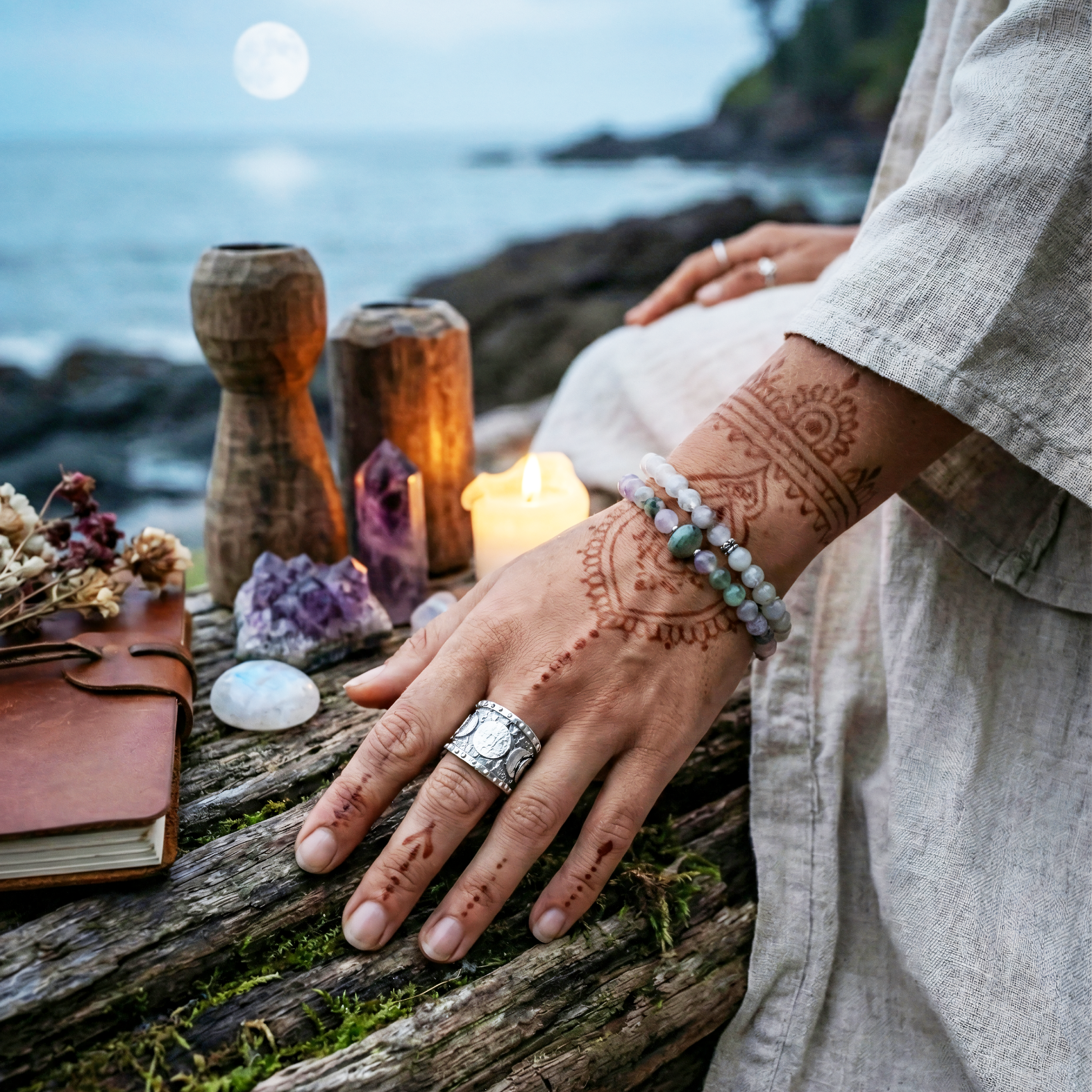 Buscaba algo diferente, que no fuera el típico anillo liso, y el modelo Ciclos de Luna es perfecto. Estoy fascinada con el trabajo de texturas que tiene; el contraste entre la plata brillante y las partes oscuritas del relieve es hermoso. Es un anillo ancho, pero súper cómodo para usar todo el día. Desde que me llegó, no me lo saco y todo el mundo me pregunta dónde lo compré. Se nota el trabajo artesanal." - Abril