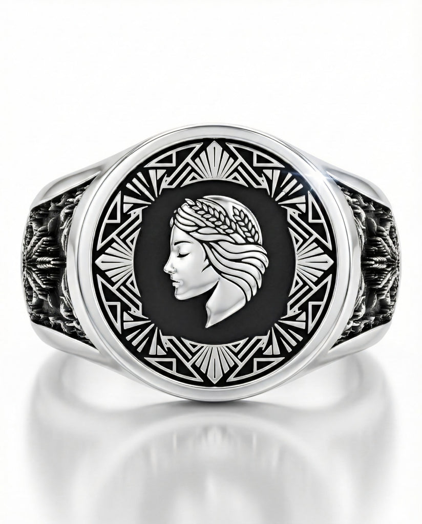Este anillo es un tributo a la precisión. En el frente, el perfil de la Doncella emerge con una serenidad absoluta. Sus rasgos son finos y clásicos, transmitiendo la calma mental que te caracteriza. La pieza está enmarcada por una guarda geométrica de líneas rectas y ángulos definidos, simbolizando la estructura y la lógica que aplicás a tu vida para que todo funcione.
